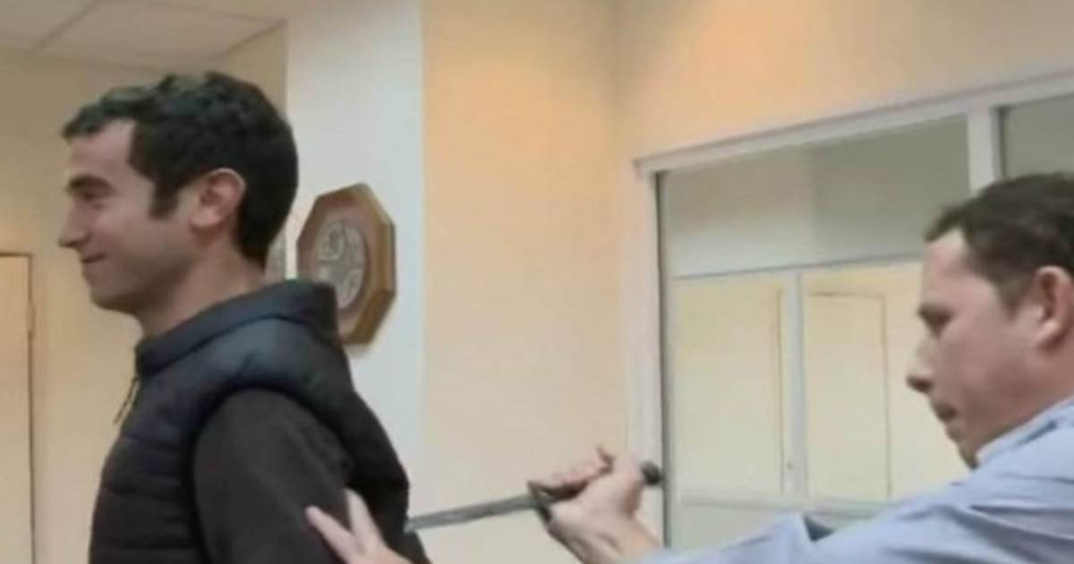 El periodista israelí Eitam Lachover fue el voluntario para demostrar la efectividad de un chaleco anticuchillo de la campaña FMS Enterprises, en Israel.