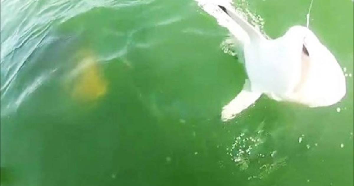 En las imágenes se observa a varias personas cazando a un tiburón, cuando de repente, aparece un mero goliat y se traga de un solo bocado al escualo.