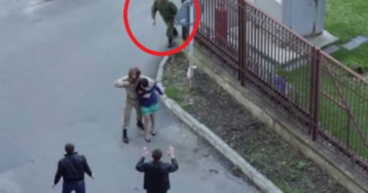 De repente en el escenario apareció un soldado verdadero que se acercó sigilosamente hacia el 'agresor' y lo inmovilizó contra el suelo.