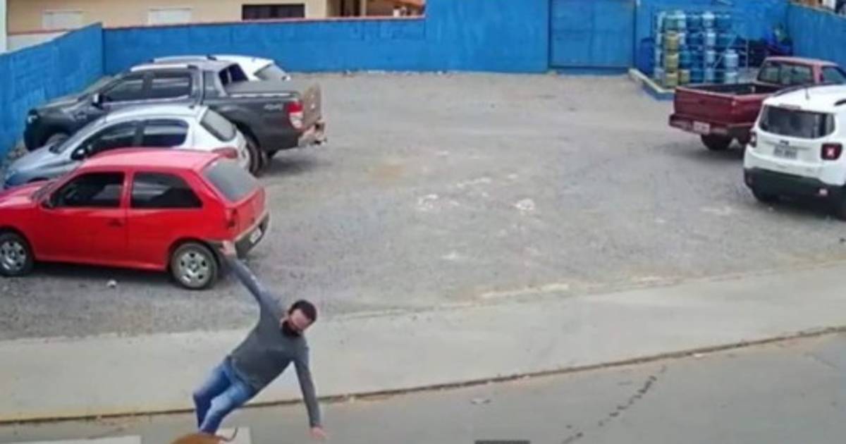 El hombre únicamente observó que no vinieran más autos antes de cruzar la vía, sin imaginar que quien lo atropellaría sería un perro. Así es, en el video se observa cuando ambos colisionan y el hombre cae de espalda y se golpea la cabeza contra un paso cebra, mientras el peludo agresor ni repara en el accidente que acaba de provocar.