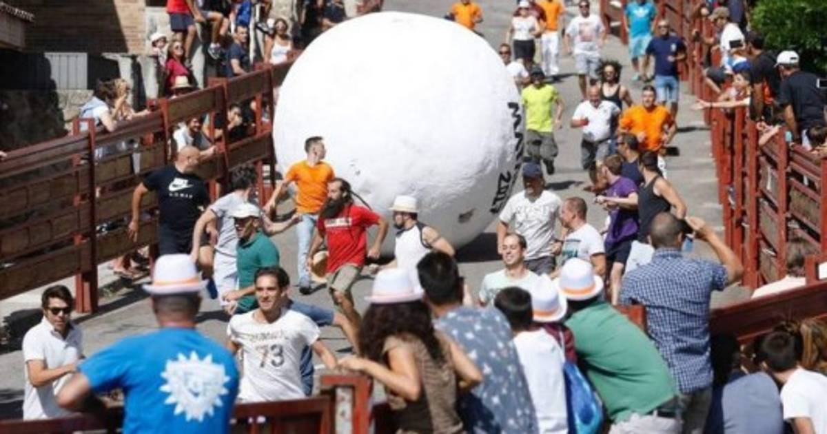 Esta vez los valientes participantes no huyen despavoridos tratando de evitar recibir una cornada de toro, si no que corren para no ser aplastado por una enorme bola.