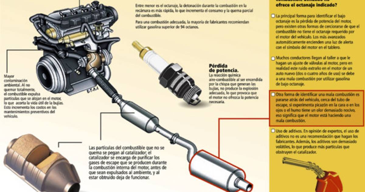 Al utilizar gasolina del octanaje adecuado el motor la quema por completo y saca el máximo rendimiento, pero si utiliza gasolina de un octanaje inferior, esta no se quema al 100% y las partículas que se quedan en el motor reducen la vida útil de las bujías y provocan problemas de encendido, parte de estos residuos se pegan al catalizador, cuya función es purificar los gases que expulsa el motor después de la combustión para que sean menos nocivos al ambiente. Una vez obstruido el catalizador se aumentan los niveles de contaminación ambiental.